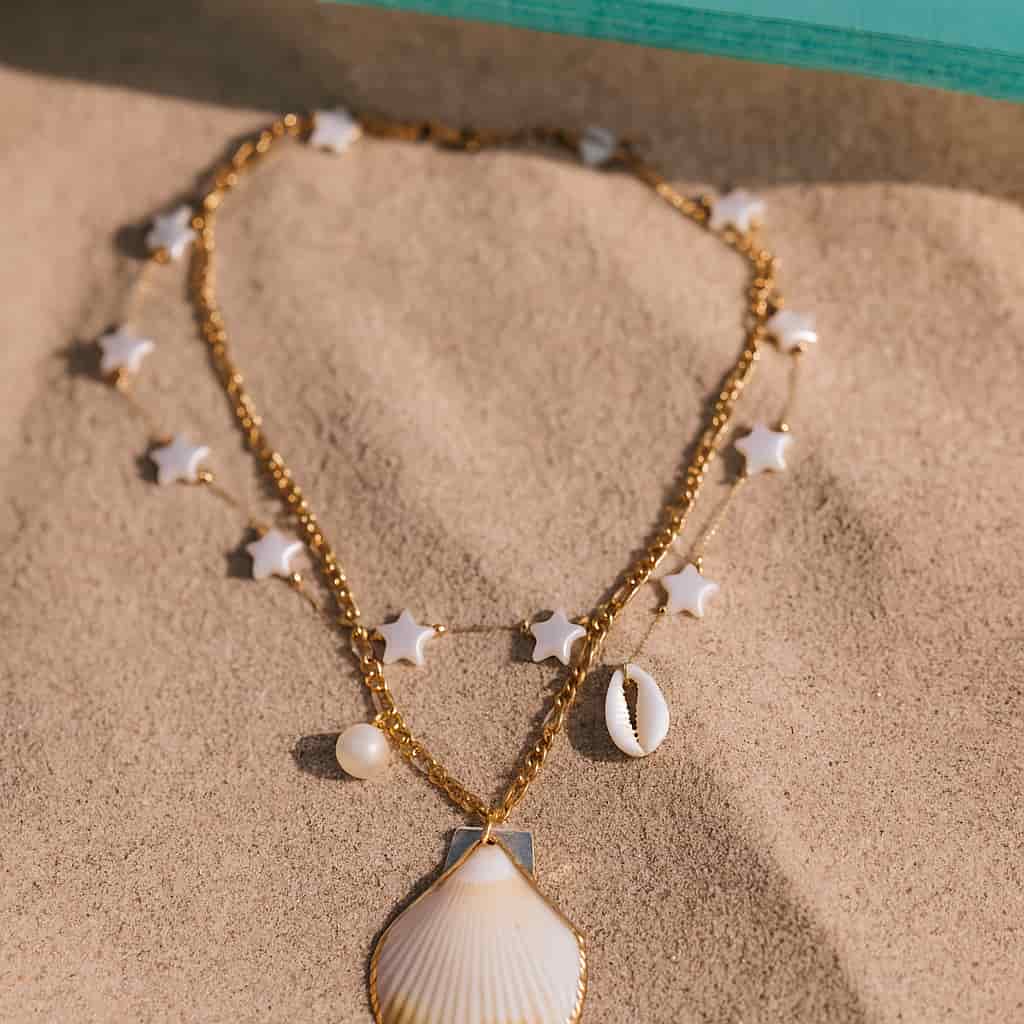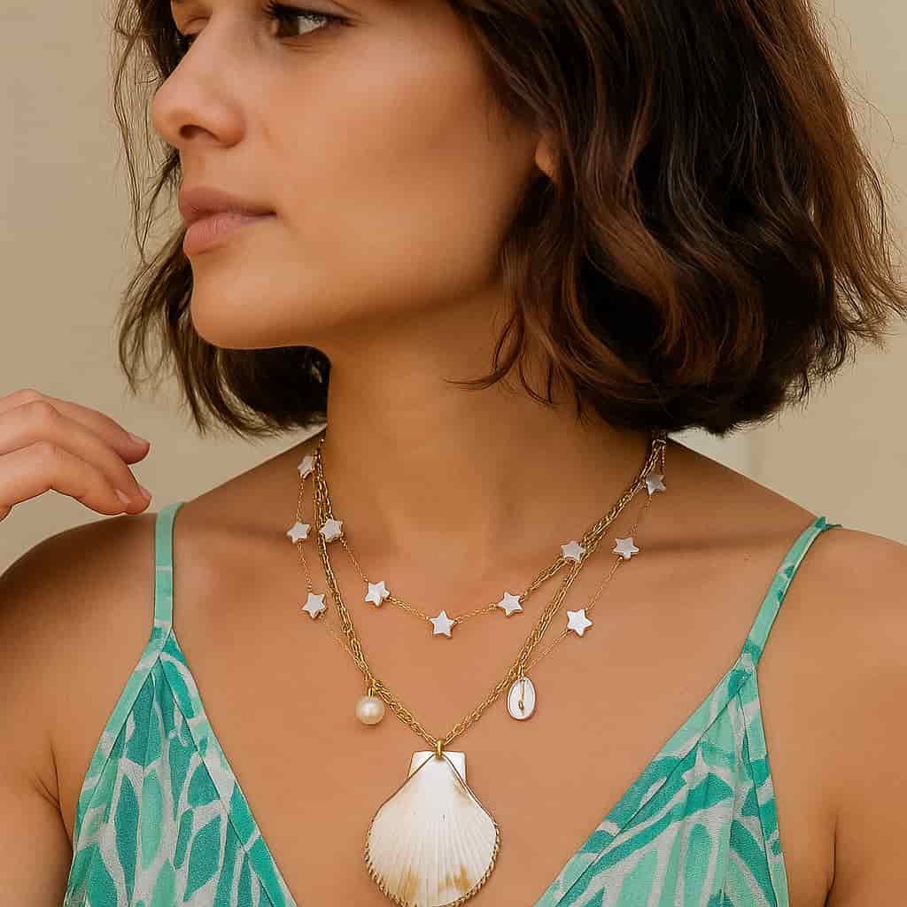 A stunning multi-strand necklace designed with a bohemian, beach-ready feel. It combines a large natural seashell pendant, a dangling pearl, and a delicate upper layer featuring multiple Mother-of-Pearl star charms.