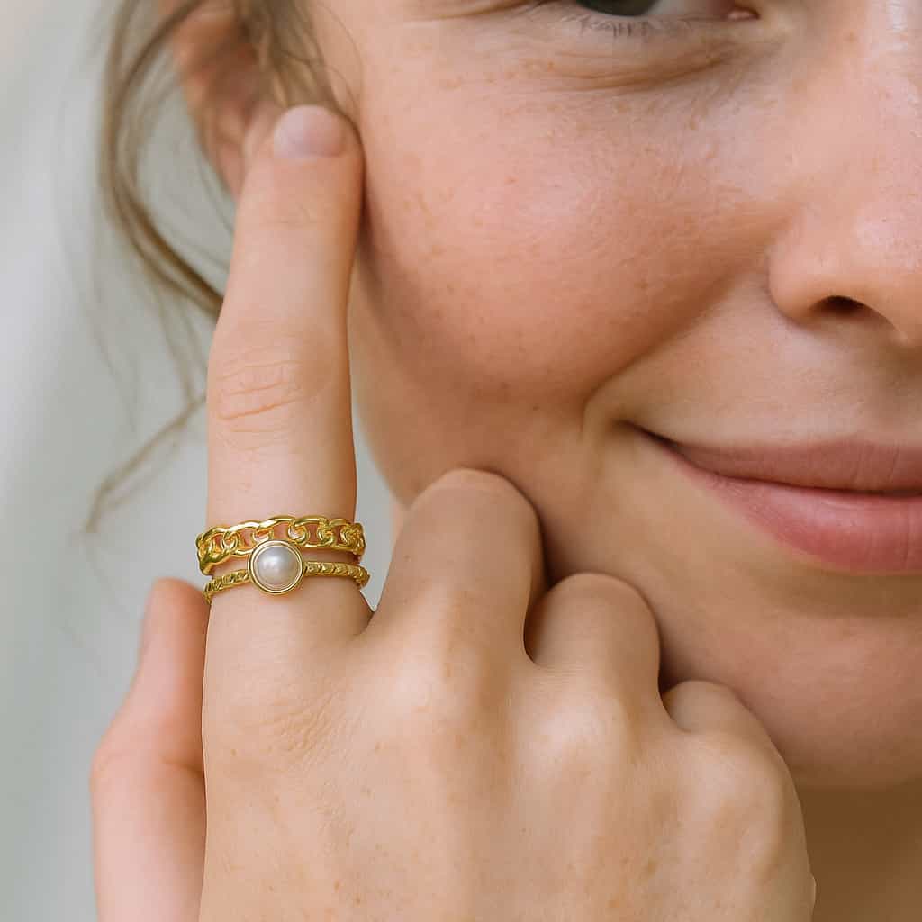 A bold, adjustable cuff ring featuring a unique double-band design: one layer with a textured finish, and the other a classic Cuban link chain. It’s completed with a sophisticated dangling pearl charm for a modern, edgy statement.
