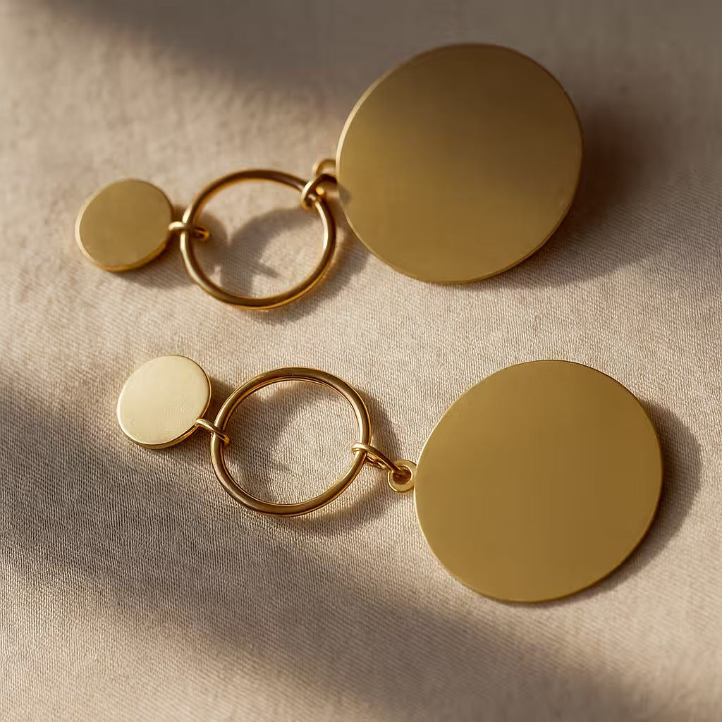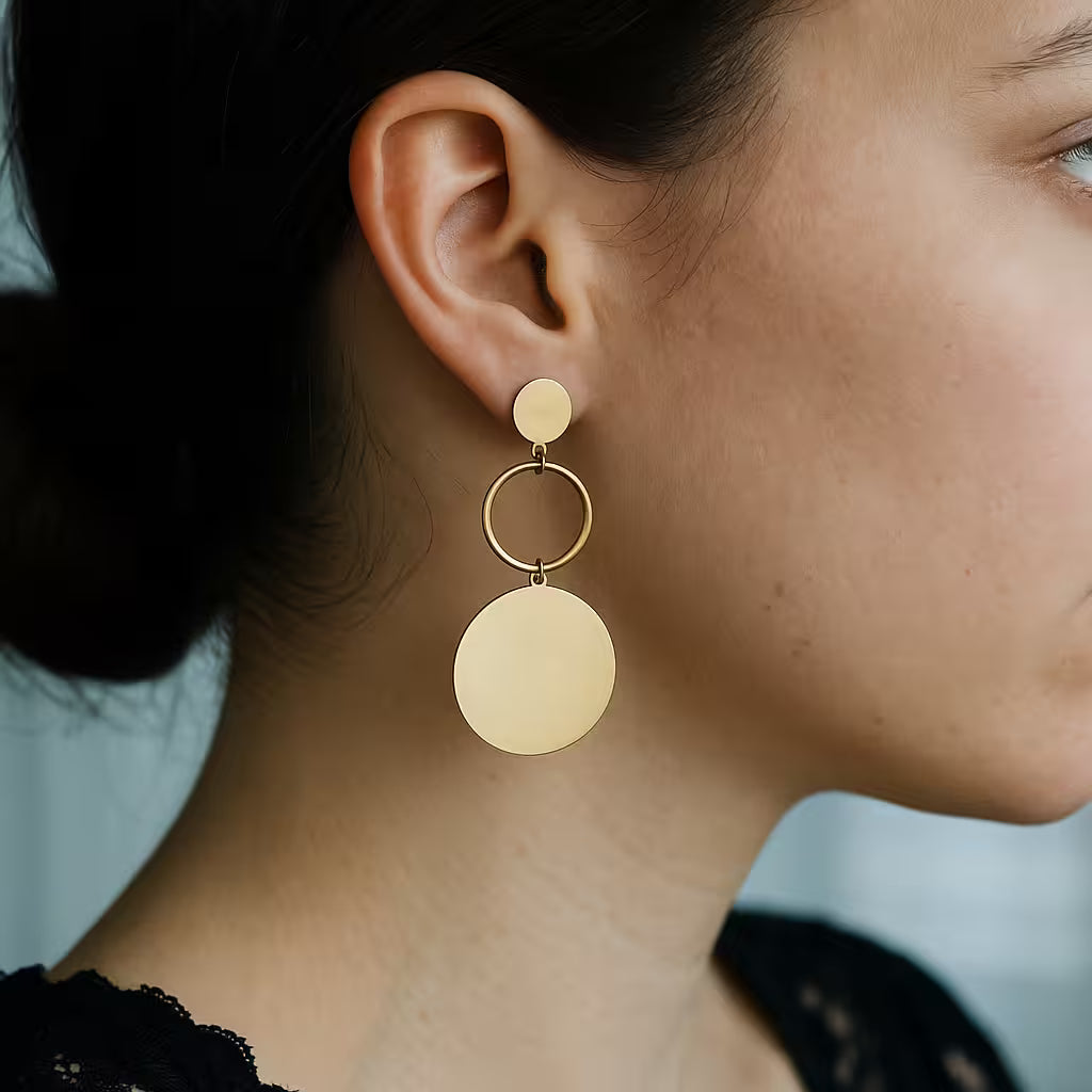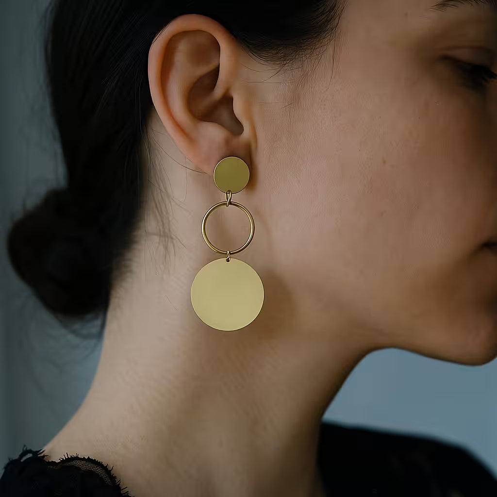 These Double Disc Earrings feature a gold-tone design with a large textured disc paired with a smaller dark disc, creating a bold yet elegant look.