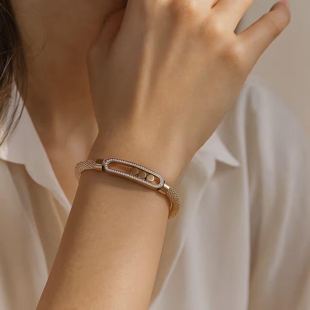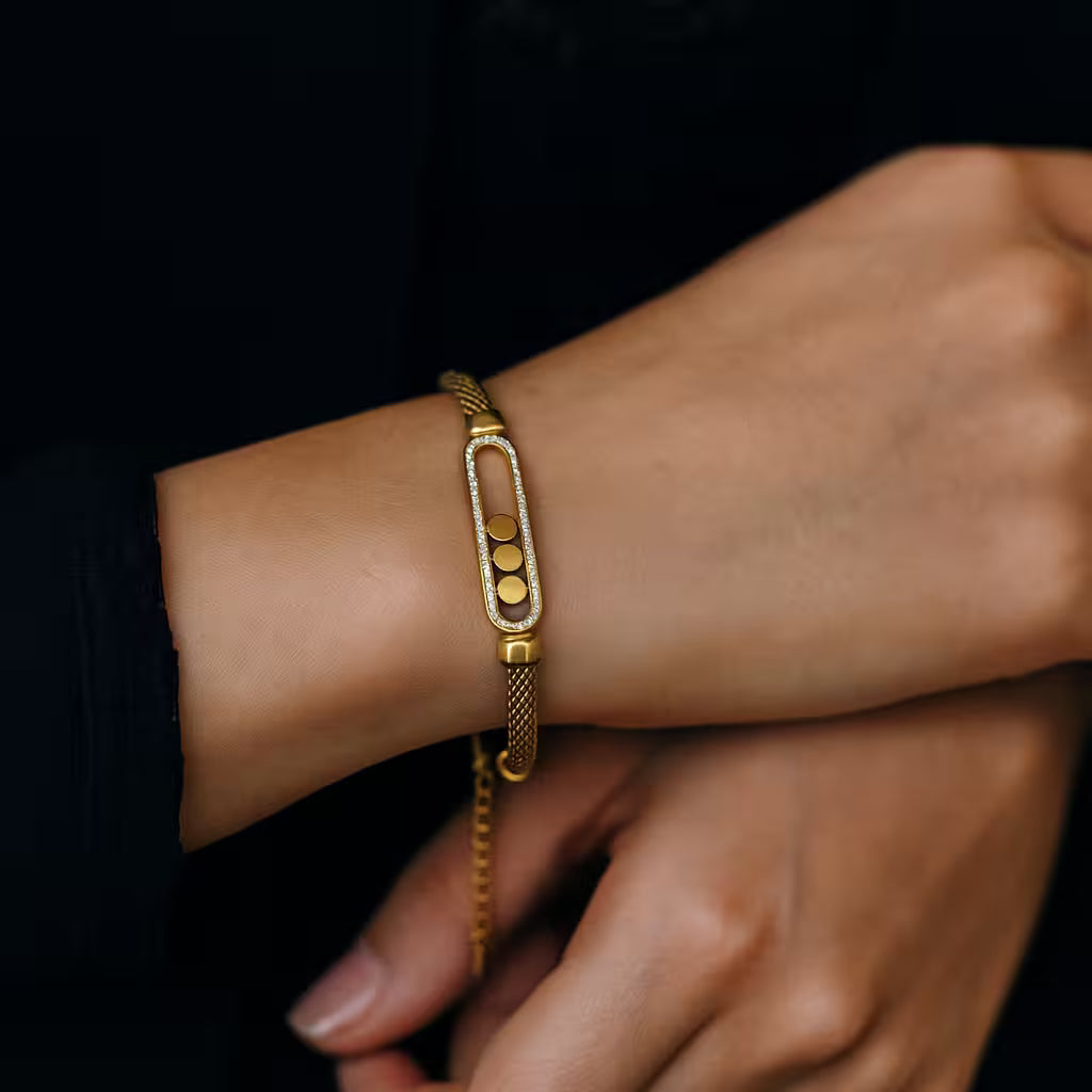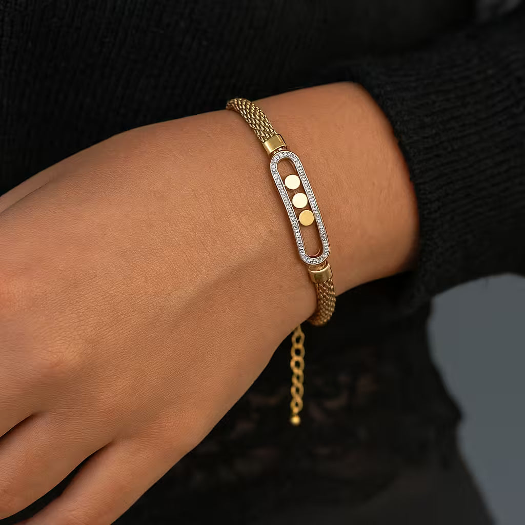 This chic Elegant Gem Bracelet features a gold-tone mesh band with a sparkling oval centerpiece adorned with three moving gold beads and clear gemstones. Adjustable with a secure clasp, it’s a perfect blend of elegance and comfort.