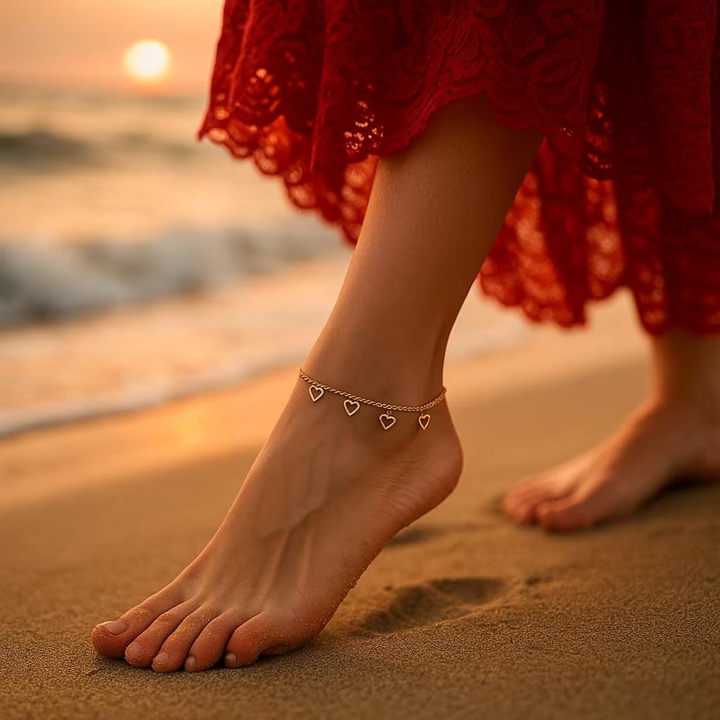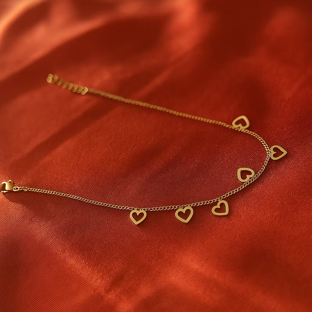 A dainty stainless steel anklet featuring a gold-tone chain with cascading open-heart charms, equipped with a secure clasp, ideal for expressing affection in a subtle, fashionable way.