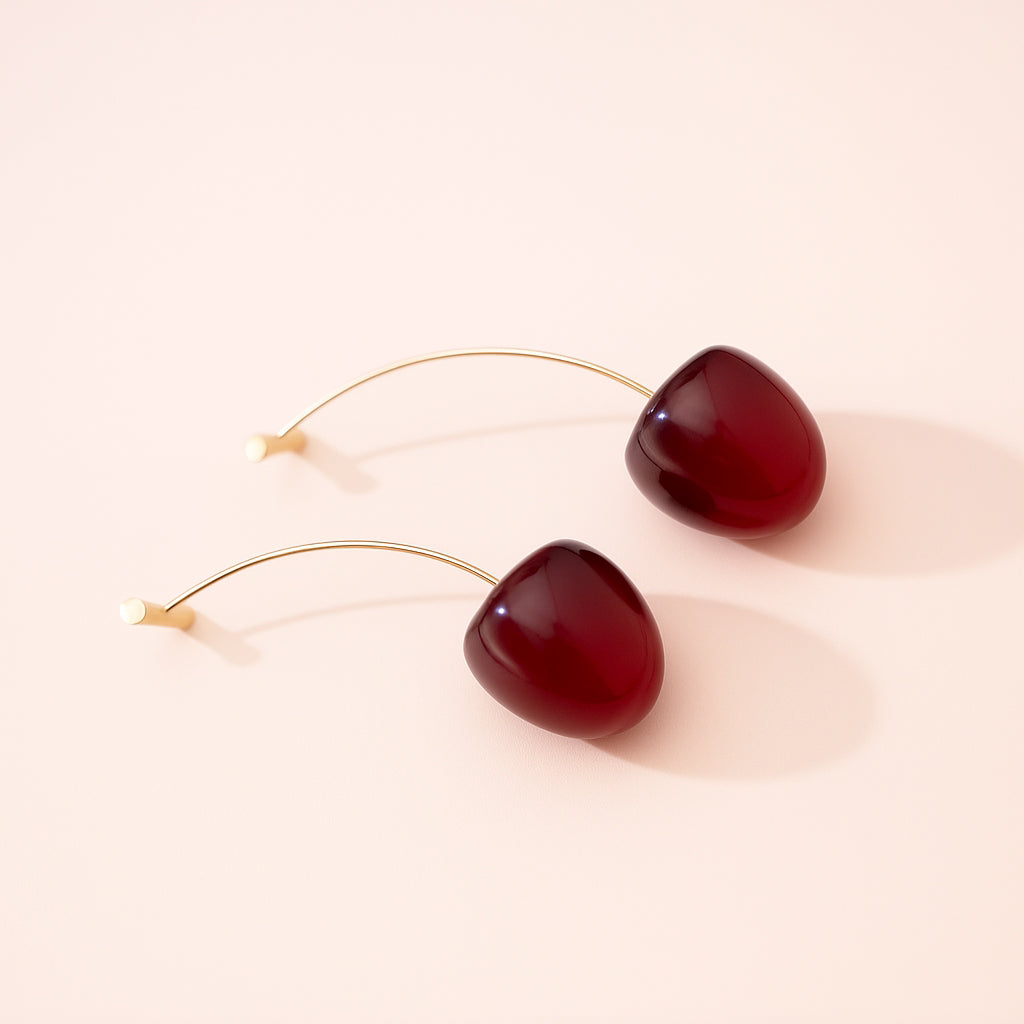 Stainless steel earrings featuring glossy red cherry-shaped beads with an elegant curved wire design, perfect for a modern look.