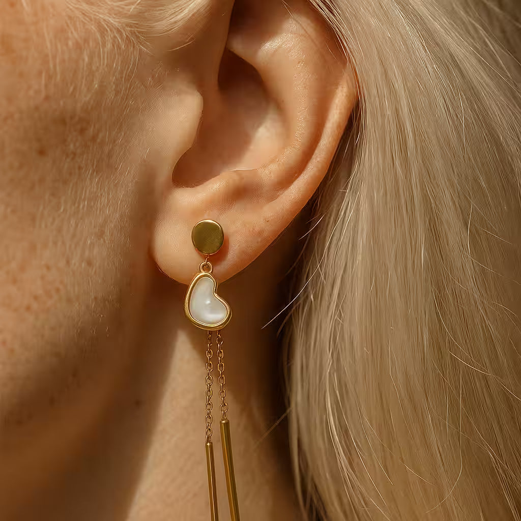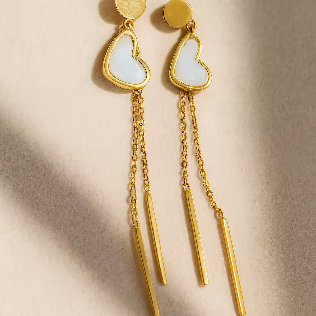 These Luminous Heart Drop Earrings feature a gold-tone design with a heart-shaped charm and a dangling gemstone, offering a romantic and elegant style.