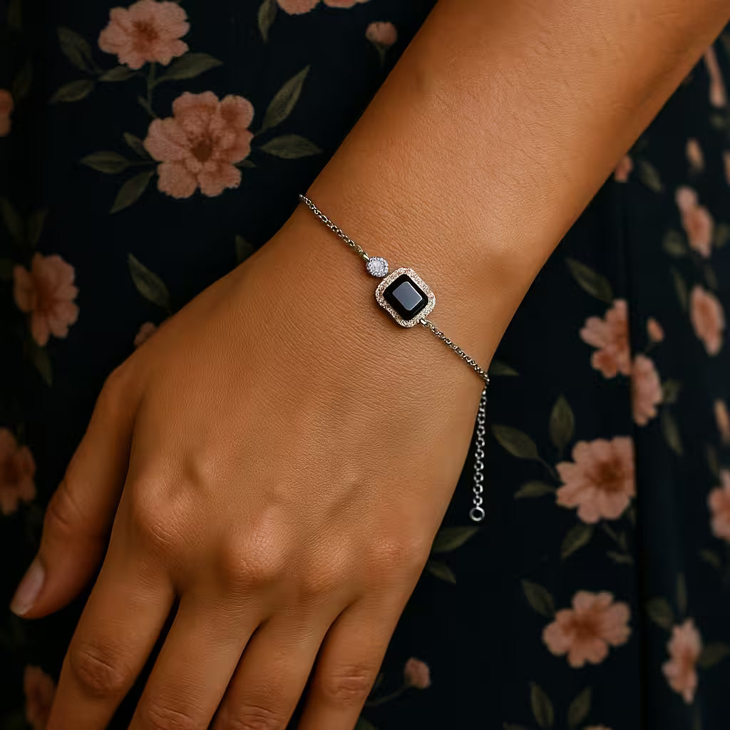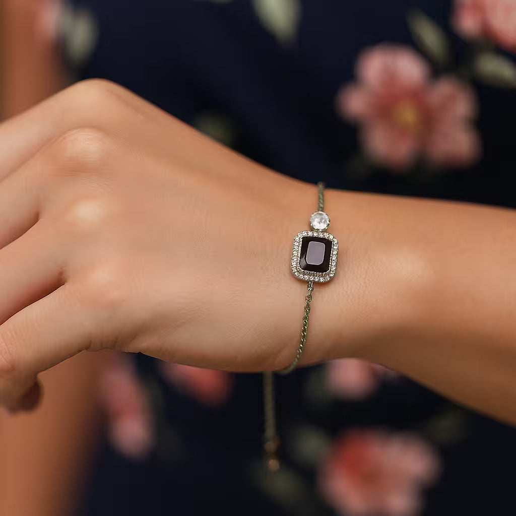 This stunning Onyx Sparkle Bracelet features a gold-tone chain with a bold black onyx stone and a sparkling clear gem, adjustable with a secure clasp for a perfect fit.