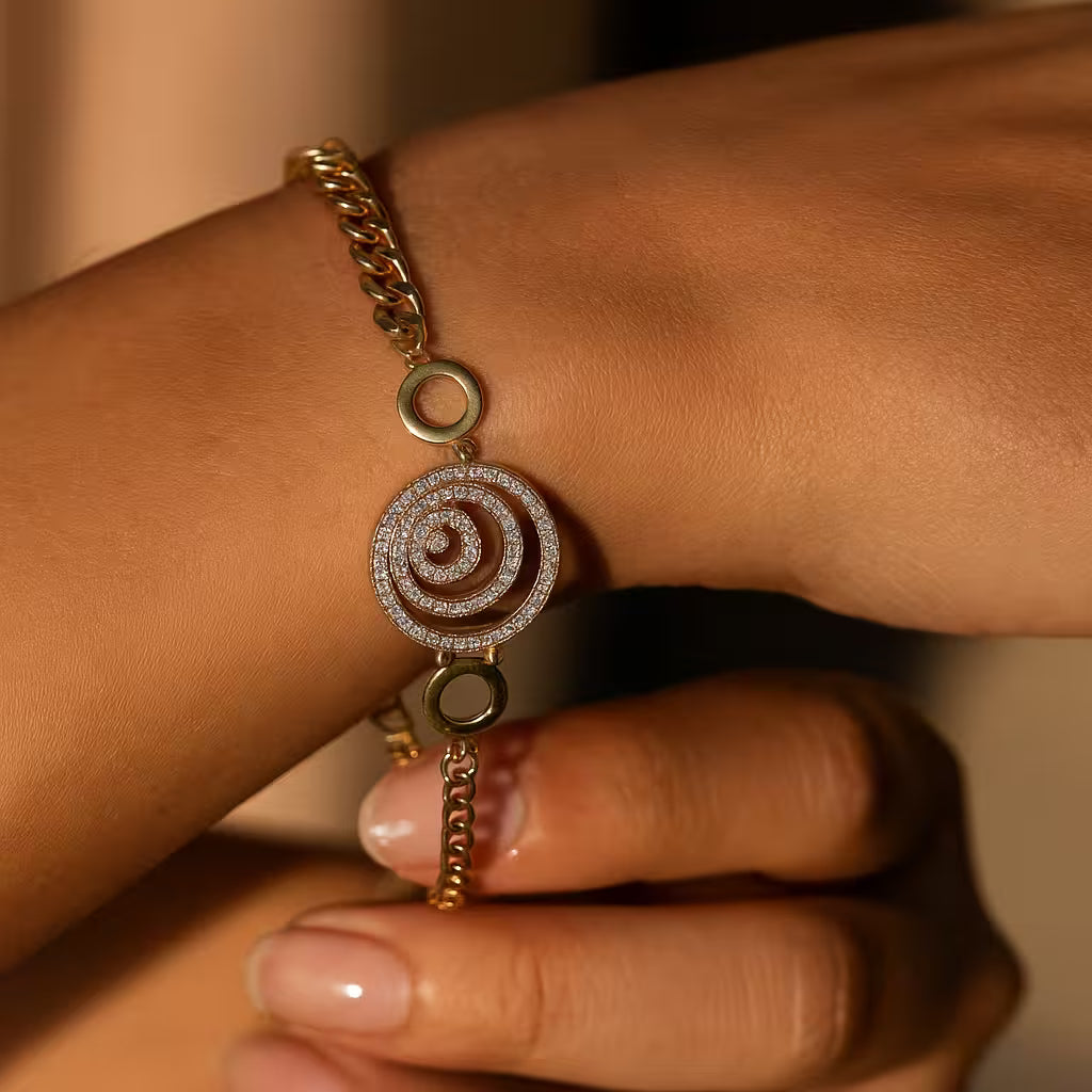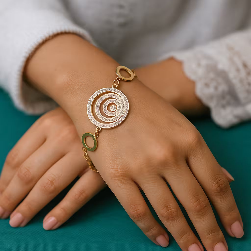A stylish stainless steel bracelet with a gold-tone chain and a sparkling circular pendant featuring concentric rings with embedded stones, ideal for a sophisticated look.