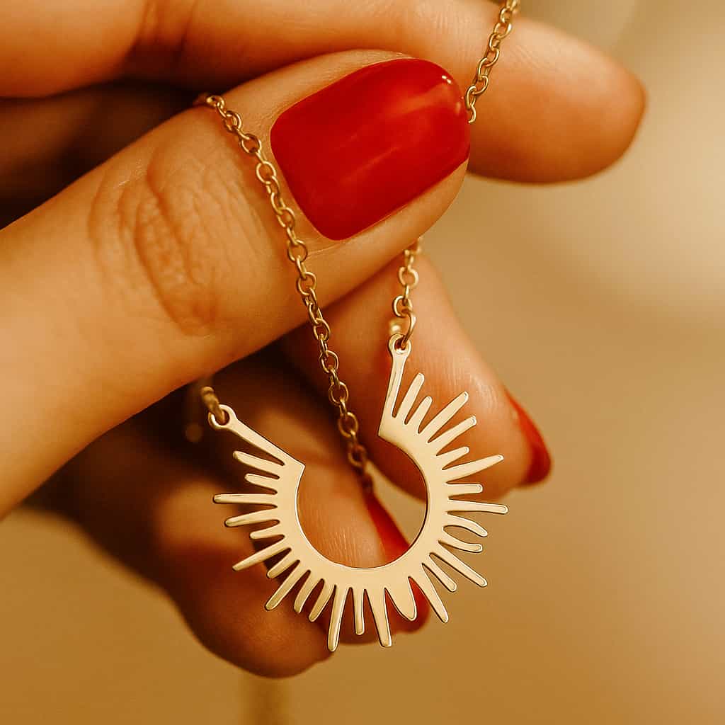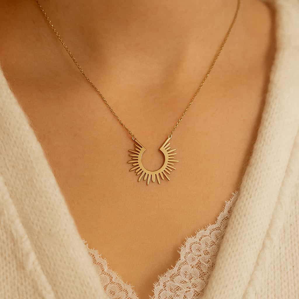 A delicate necklace capturing the moment of dawn with its radiant, semi-circular sunburst design. Add a subtle, warm glow to your neckline with this everyday essential.