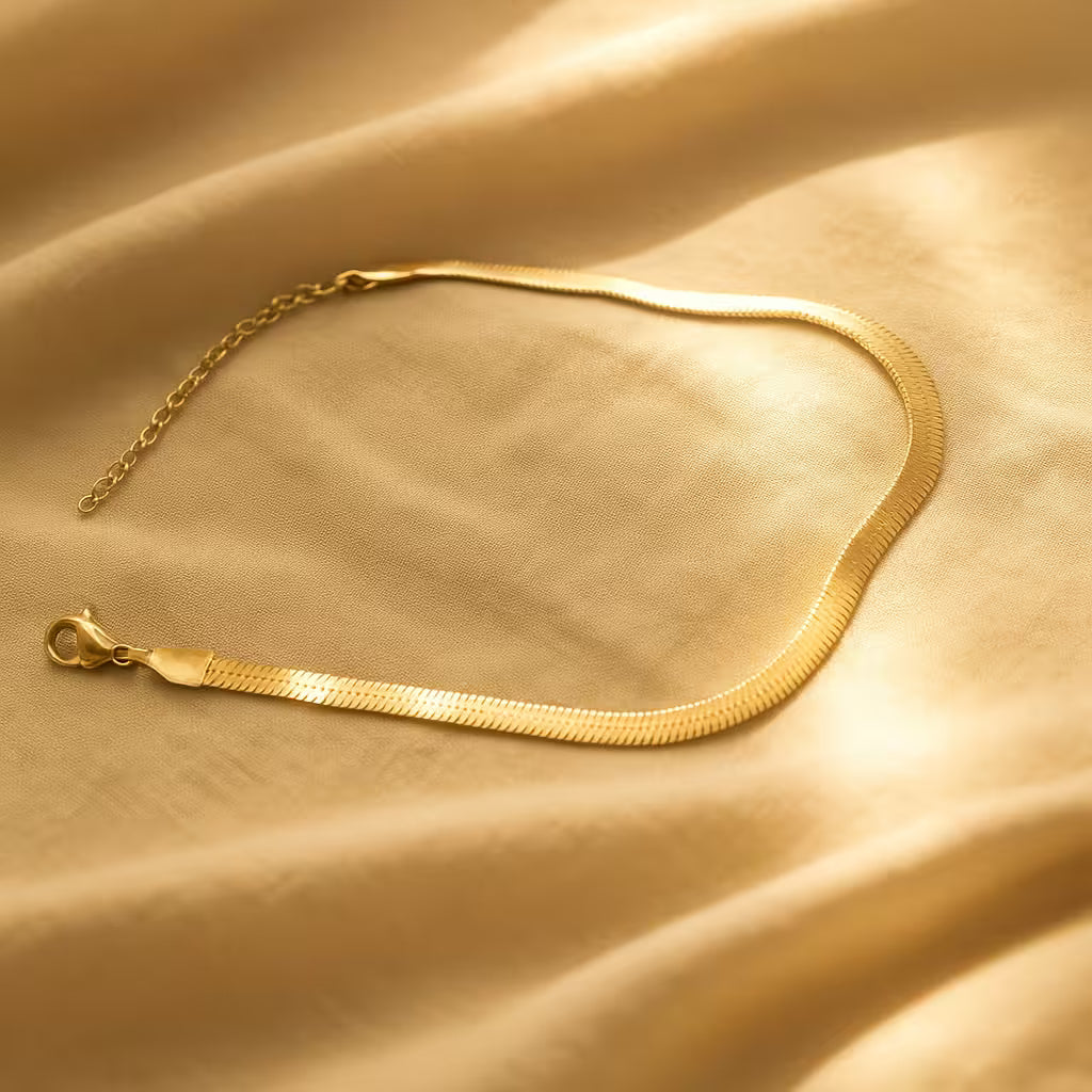 A sleek stainless steel anklet with a gold-tone satin finish and a snake-skin-like chain design, featuring a secure clasp, perfect for a minimalist yet bold ankle accessory.