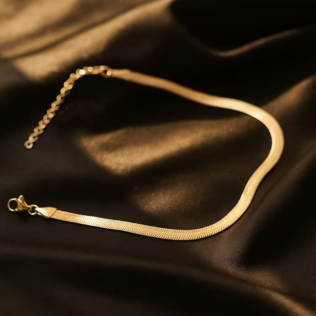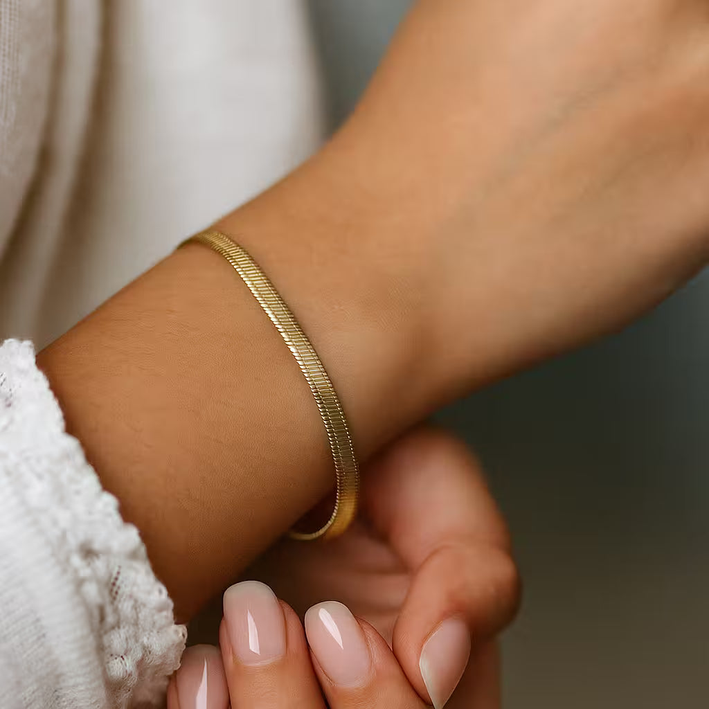 This Snakeskin Bracelet features a sleek, snake-like gold chain with an adjustable clasp for a comfortable fit, perfect for a minimalist and stylish look.