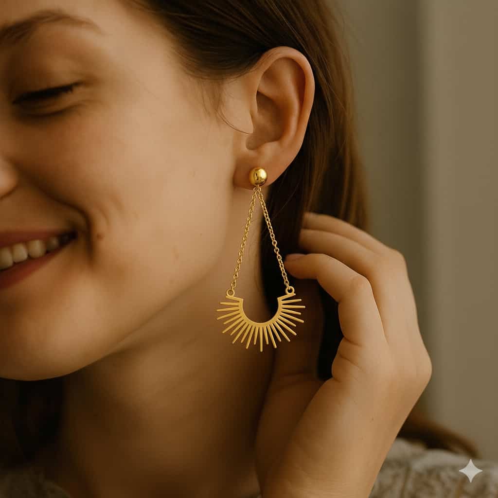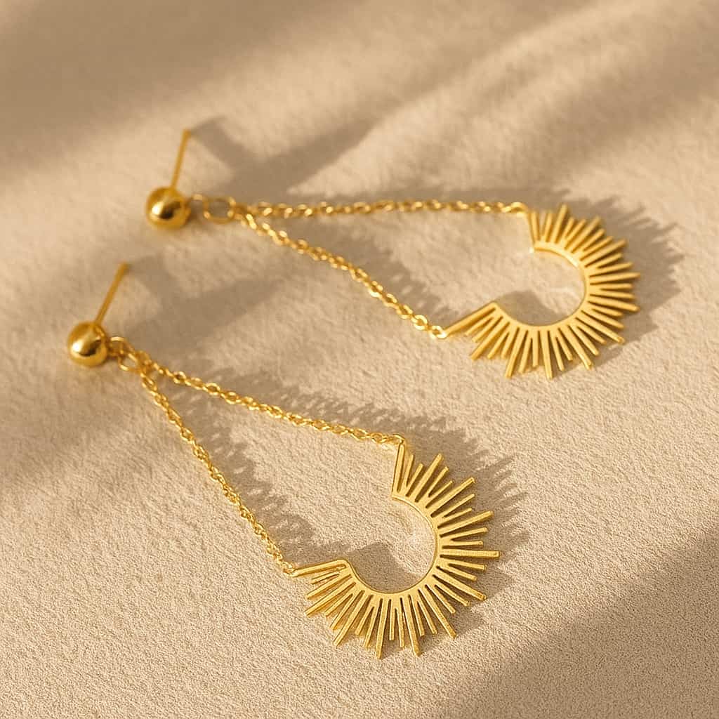 These Sunburst Drop Earrings feature a gold-tone design with a radiant sunburst shape and delicate chain, offering a chic and elegant style.