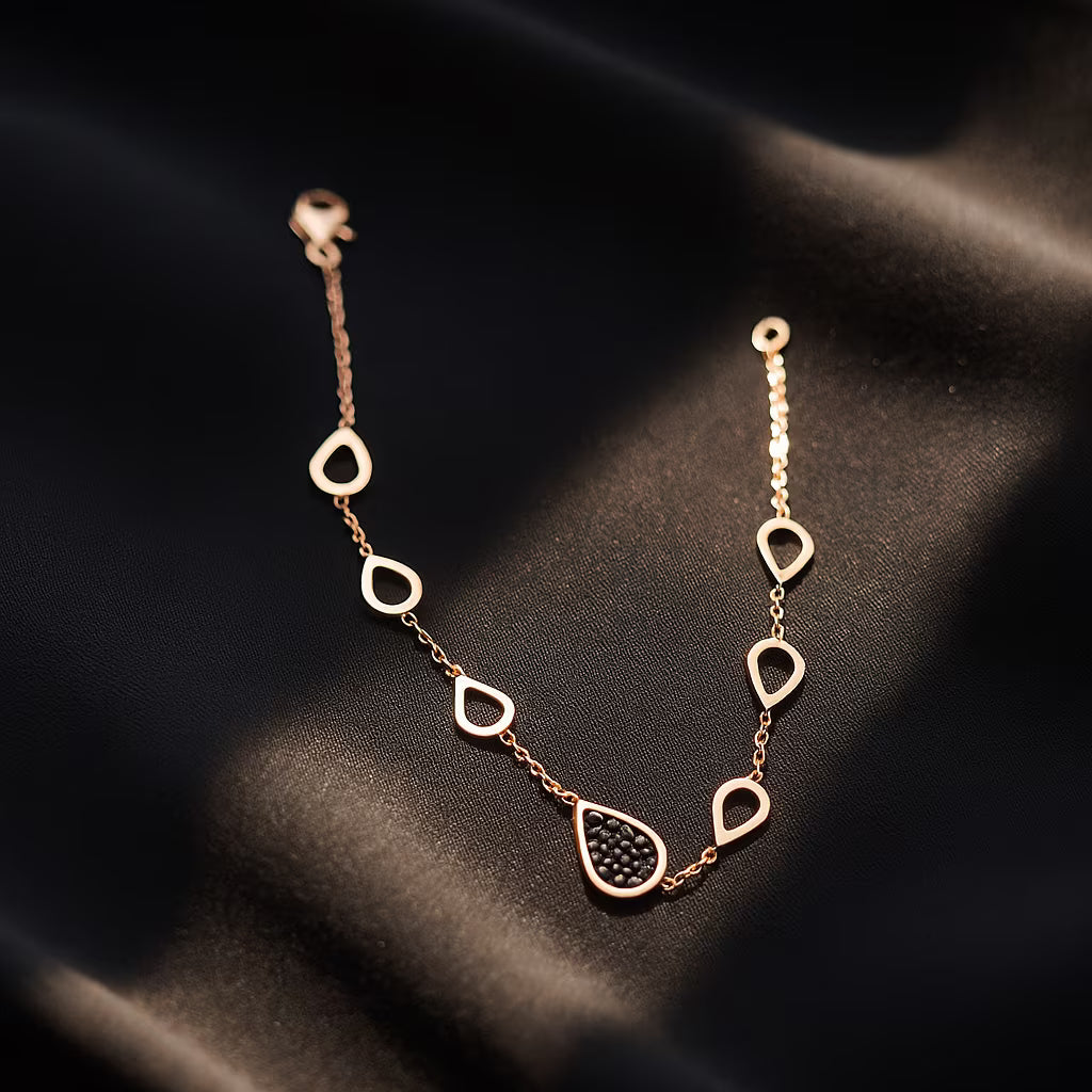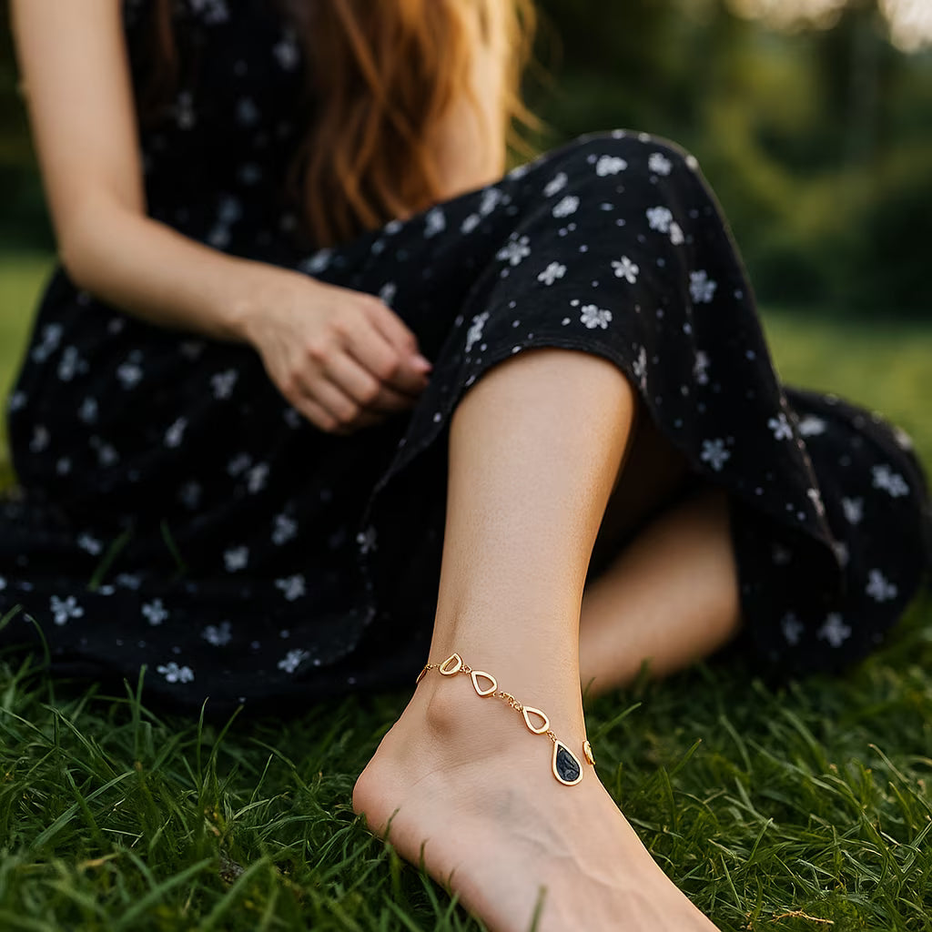 A delicate stainless steel anklet with a gold-tone chain featuring dangling teardrop-shaped charms, one with a sparkling dark gem, and a secure clasp, perfect for a refined and eye-catching ankle accessory.