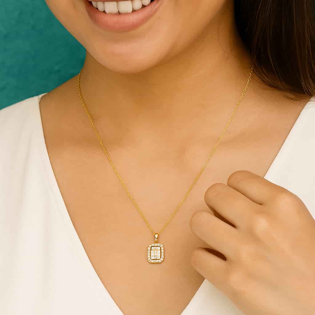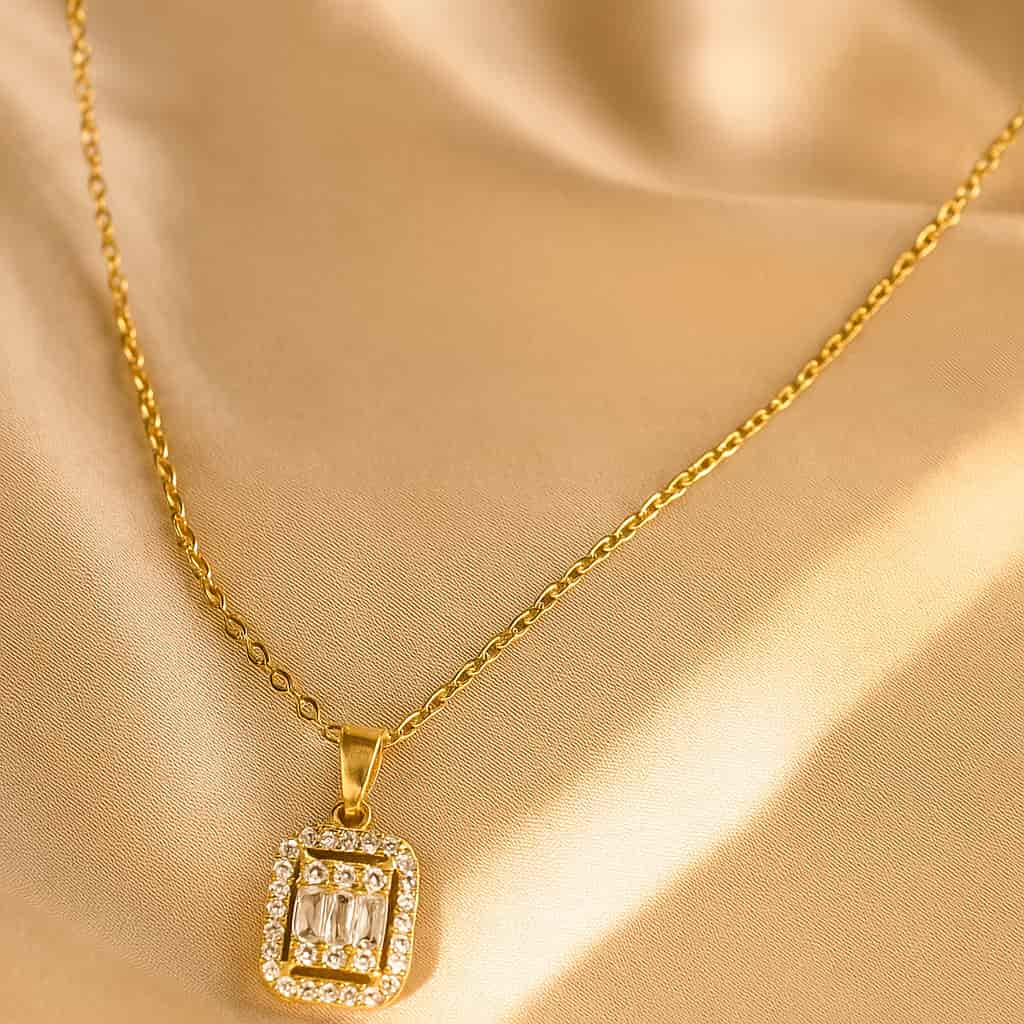 A sophisticated gold-tone necklace featuring three center baguette-cut crystals framed by a sparkling micro-pave halo. This modern classic offers brilliant, understated luxury perfect for daily wear or formal events.