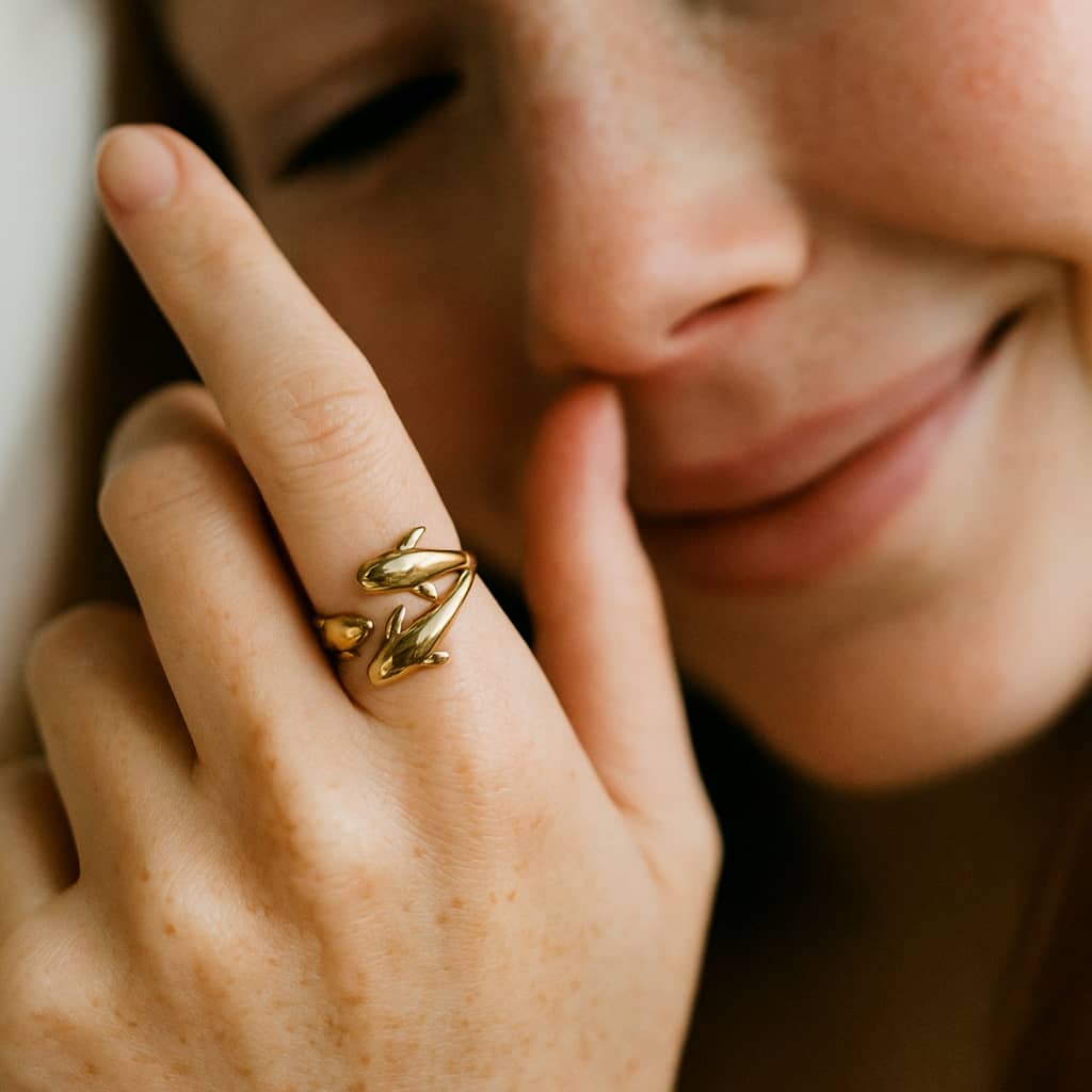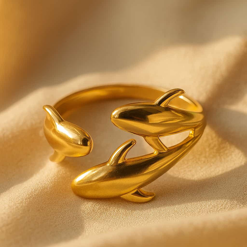 An open cuff, adjustable ring featuring a polished, three-dimensional sculptural design of two opposing dolphins forming a circle. A distinctive marine piece symbolizing harmony, joy, and deep connection.