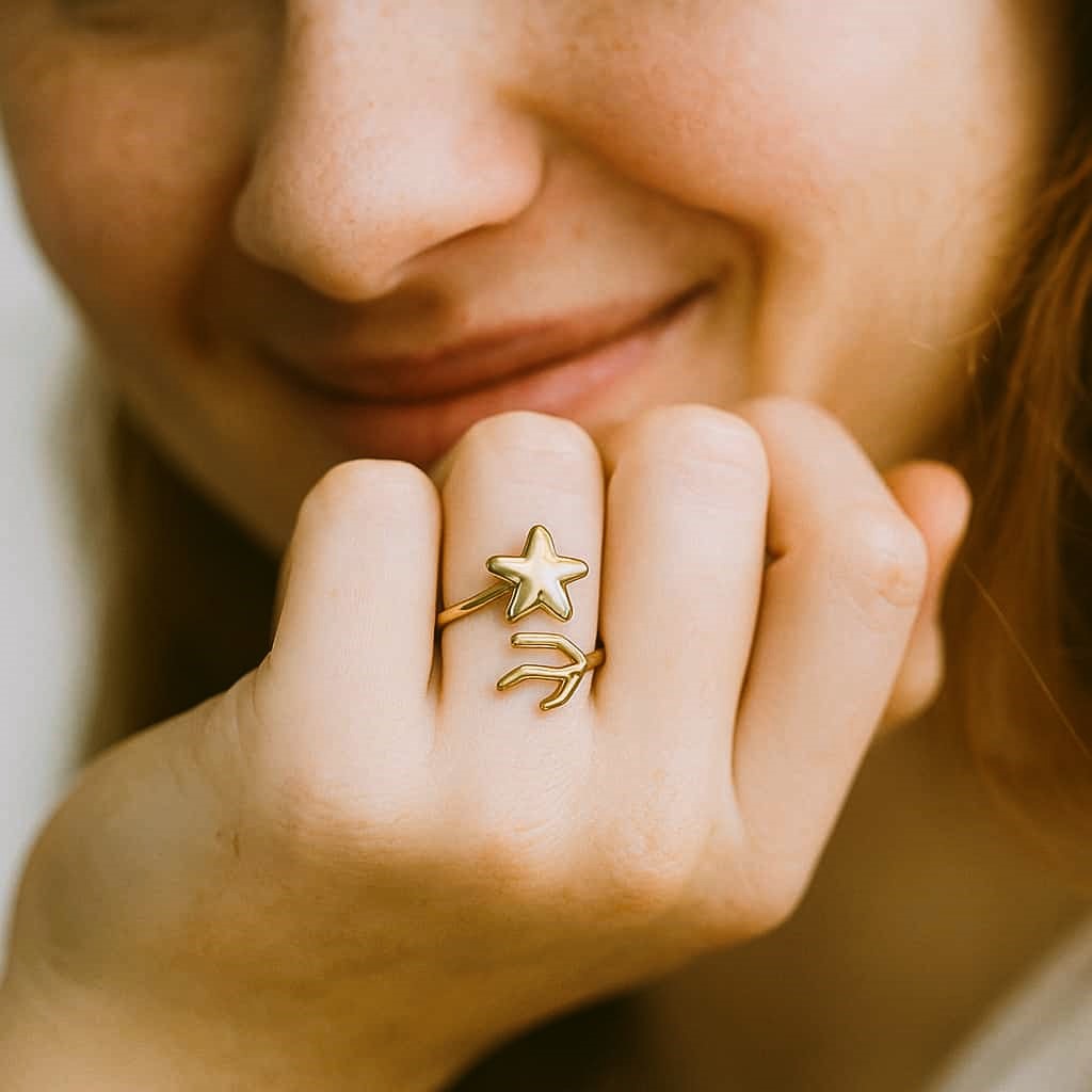 A polished, open cuff ring featuring an artistic design with a prominent star on one end and an elegant, curved extension on the other. This simple yet captivating design adds a modern, celestial touch to your look.
