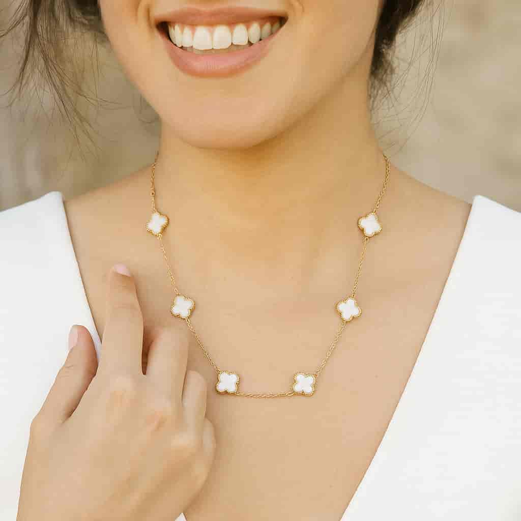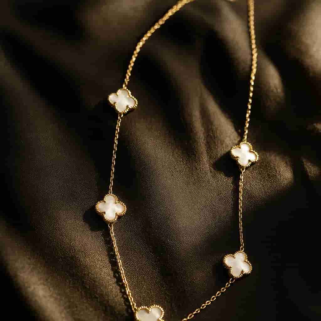 An elegant long-chain necklace featuring five radiant Mother-of-Pearl clover stations set in a delicate gold-tone chain. This piece adds a beautiful, subtle luminescence to your look, perfect as a chic everyday or layering piece.