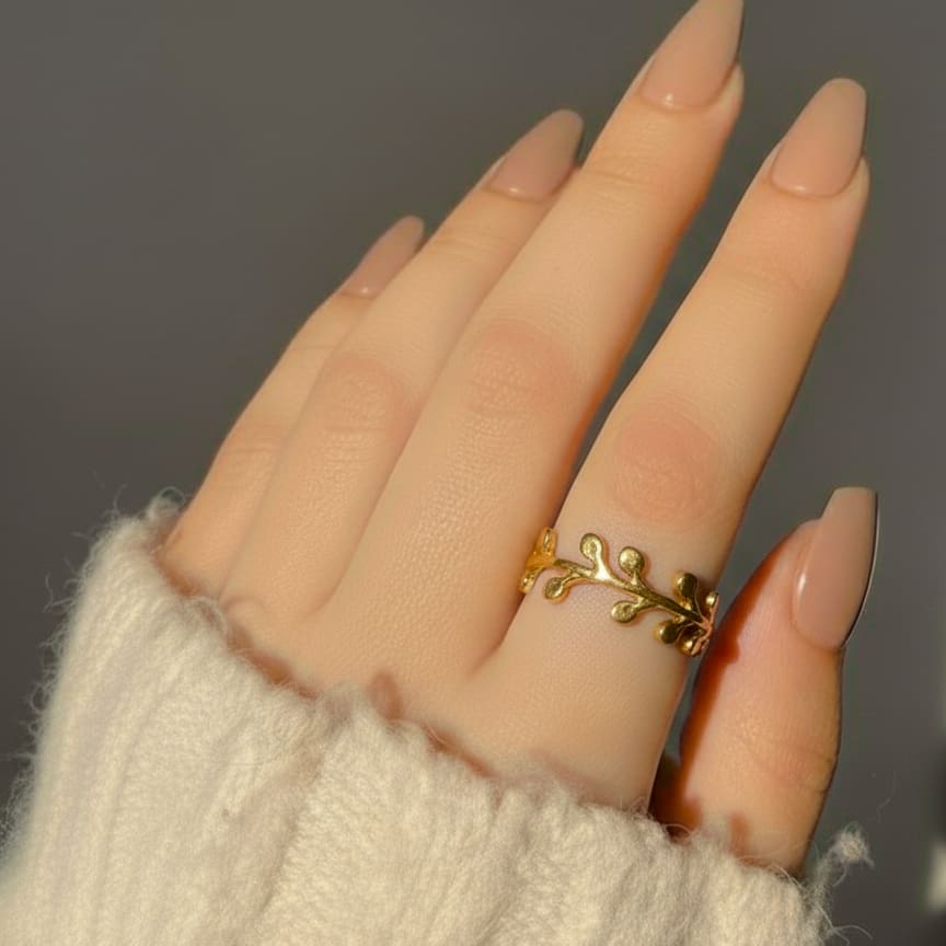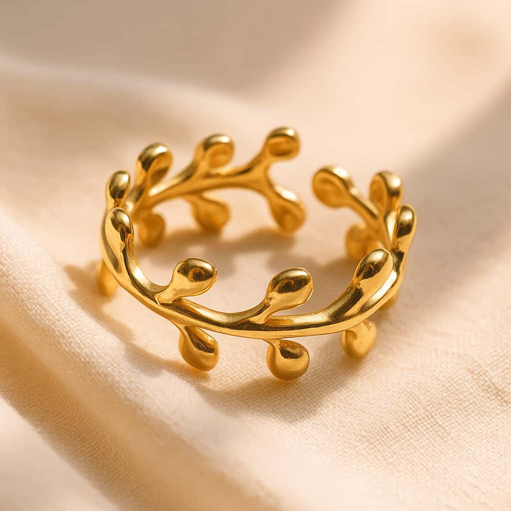 An open cuff, adjustable ring featuring an artistic design that wraps around the finger in the shape of a delicate tree branch or trailing leaves. This soft, organic design adds a touch of tranquil nature to your look.