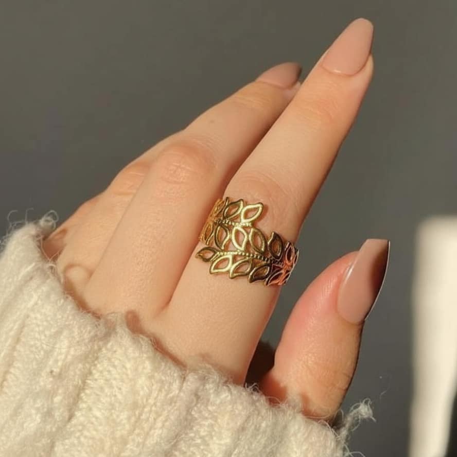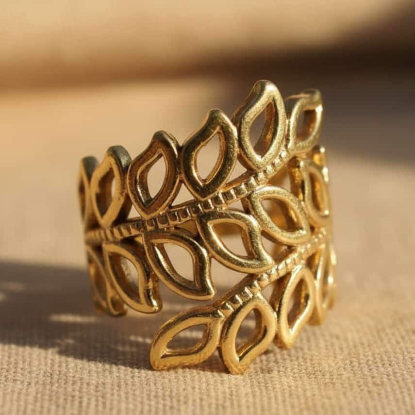 A bold, wide open cuff ring featuring an intricate, dense artistic design of delicately intertwined and sculpted leaves. This statement piece delivers a luxurious, organic touch inspired by nature.