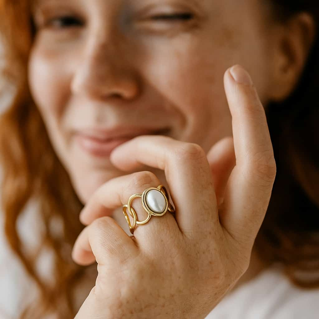 A distinctive open cuff ring featuring an artistic, woven gold band that encircles a central, luminous freshwater pearl. This statement piece offers an elegant, organic design that adjusts easily for a comfortable fit.
