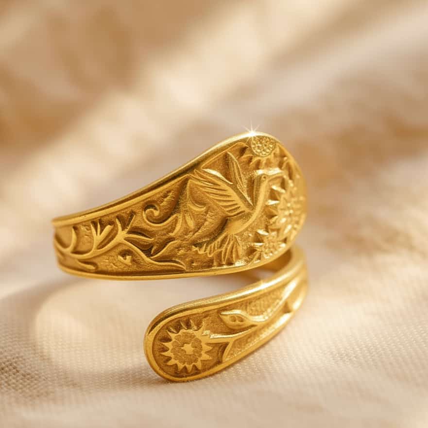 An open cuff, adjustable ring featuring a wide spiral design decorated with vintage etchings including a dove and floral motifs. An artistic, antique piece that gives your look a luxurious and unique character.