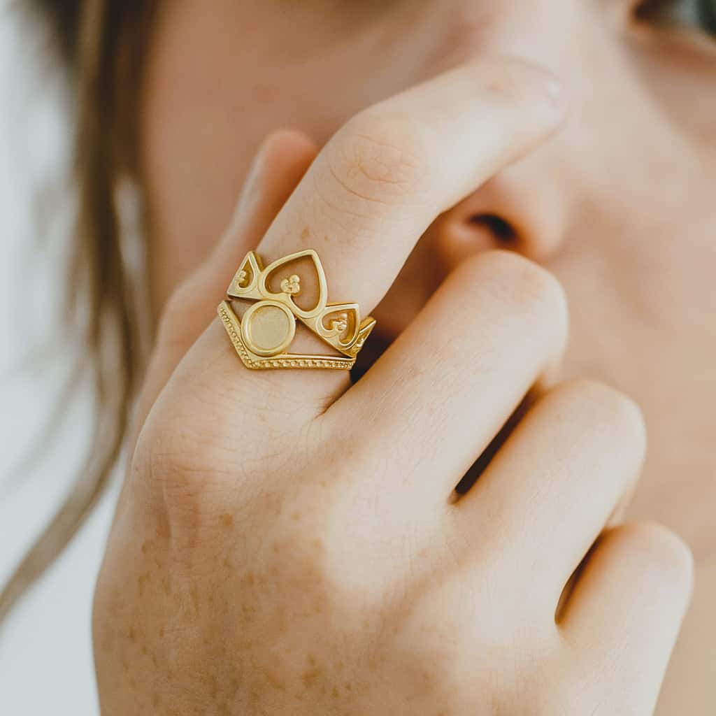 A bold, vintage-inspired ring featuring a design reminiscent of a royal crown, adorned with heart-shaped etchings and a V-shaped base ready for a central stone. A distinctive piece that delivers a princess-like look.