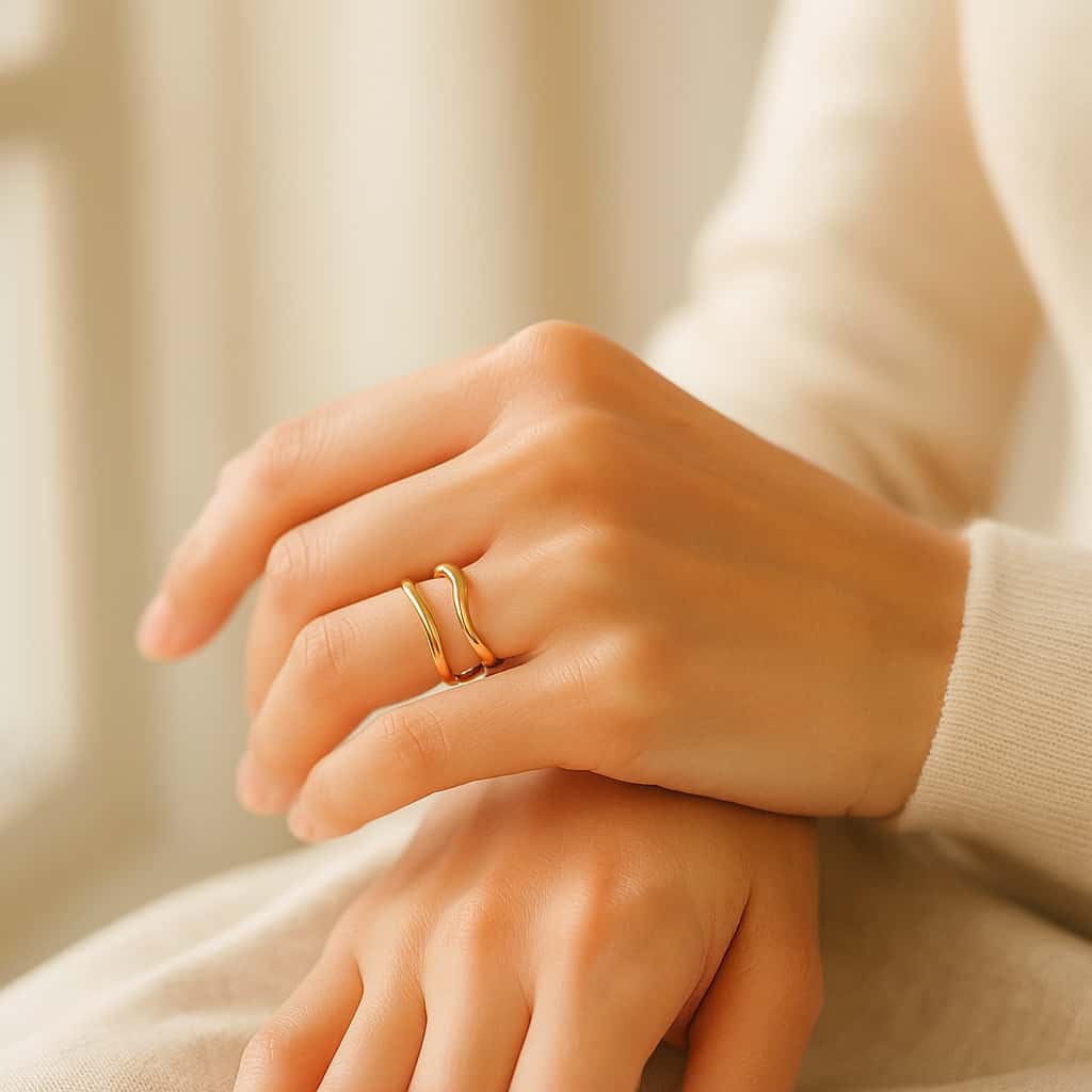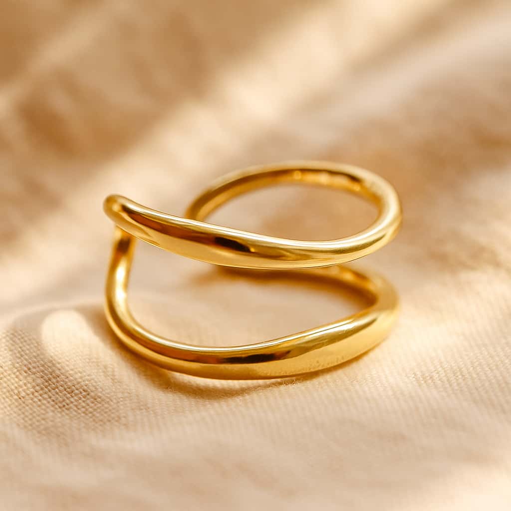 A bold, open cuff ring featuring two thick, polished gold bands that gracefully intersect in an elegant spiral design. This modern, comfortable piece adds a touch of movement and dynamism to your look.