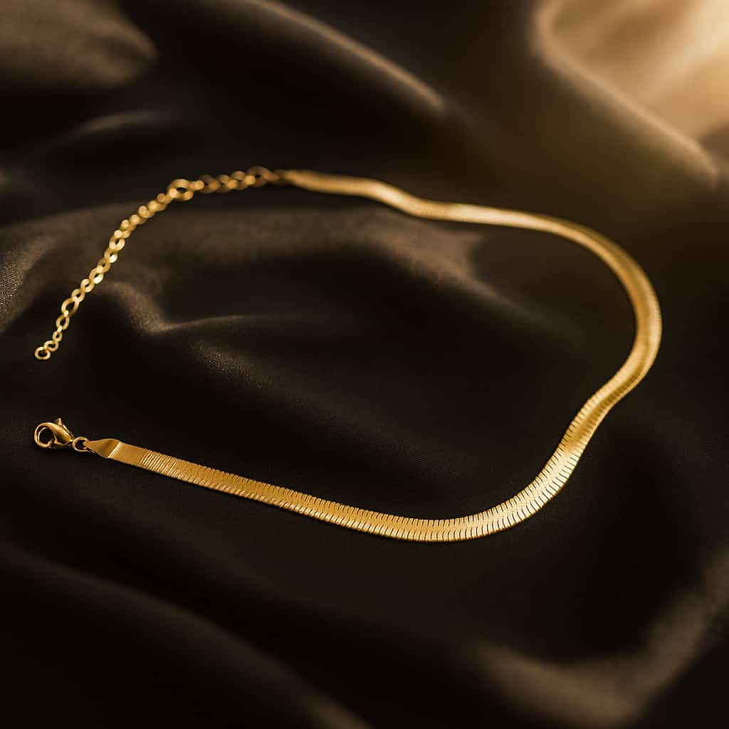 An ultra-wide gold-tone necklace featuring a highly reflective Herringbone design that mimics the smooth texture of snakeskin. This piece offers a sleek, minimal flash of gold perfect for a sophisticated, everyday look.